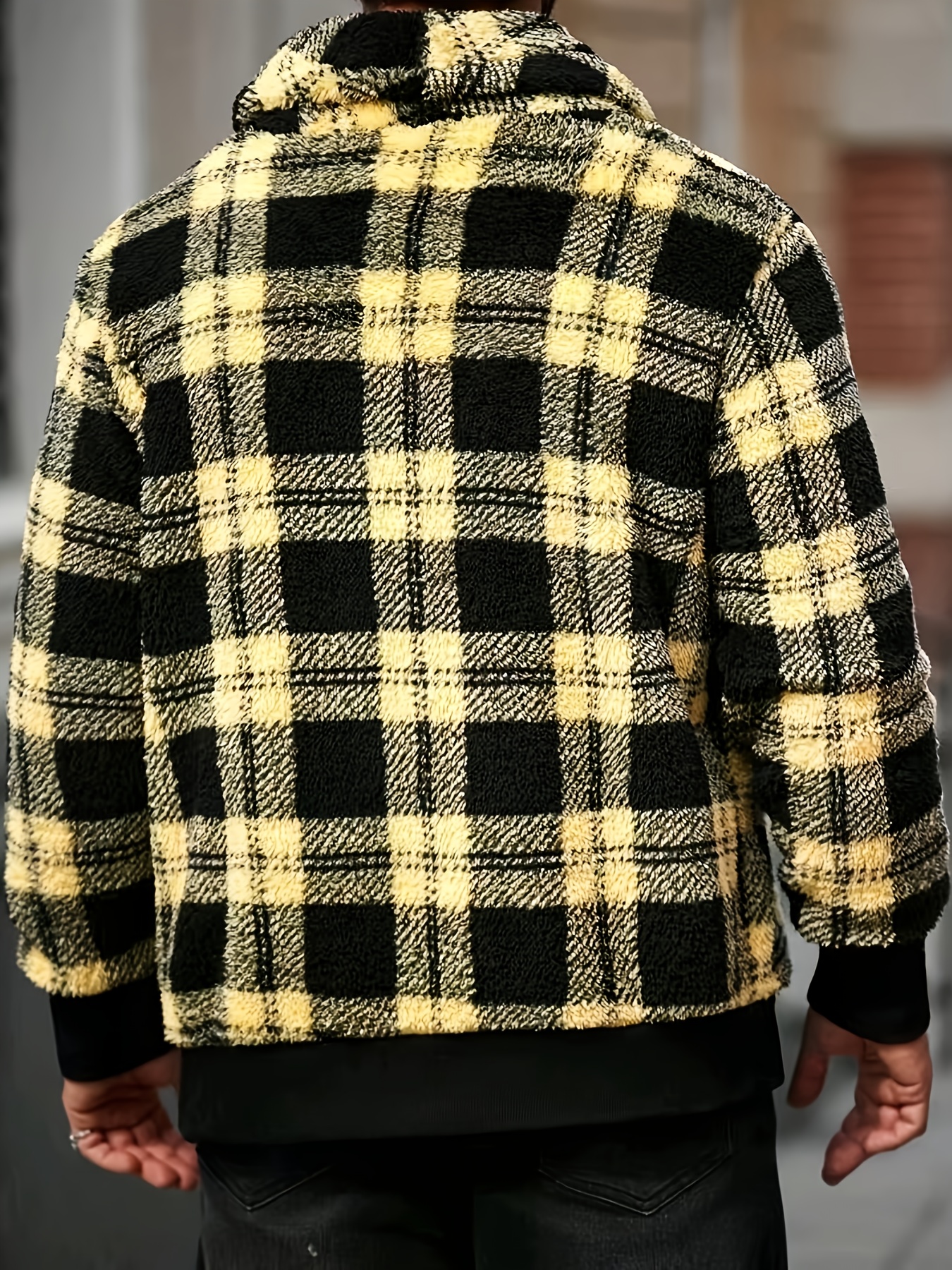 Men’s Plush Checkered Jacket – Black & Yellow Soft Thermal Fall/Winter Coat